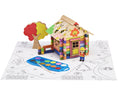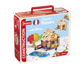 Természetes fából készült, kifesthető építőjáték kiegészítőkkel, festékkészlettel és szerelési útmutatóval egy kis bőröndben.