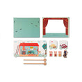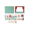 Ebben a színházban két mágneses fapálcával a gyerekek úgy mozgathatják a híres mese szereplőit, mintha egy igazi színpadon játszanának. A kartonpapír háttér segítségével lehet követni a történetet, amint az az erdőben és az egyes házakban kibontakozik.