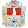 Fából készült, festett, figurákkal díszített bábszínház, Michelle Carlslund tervezésében. Olyan szép, hogy dekorációnak is megállja a helyét.