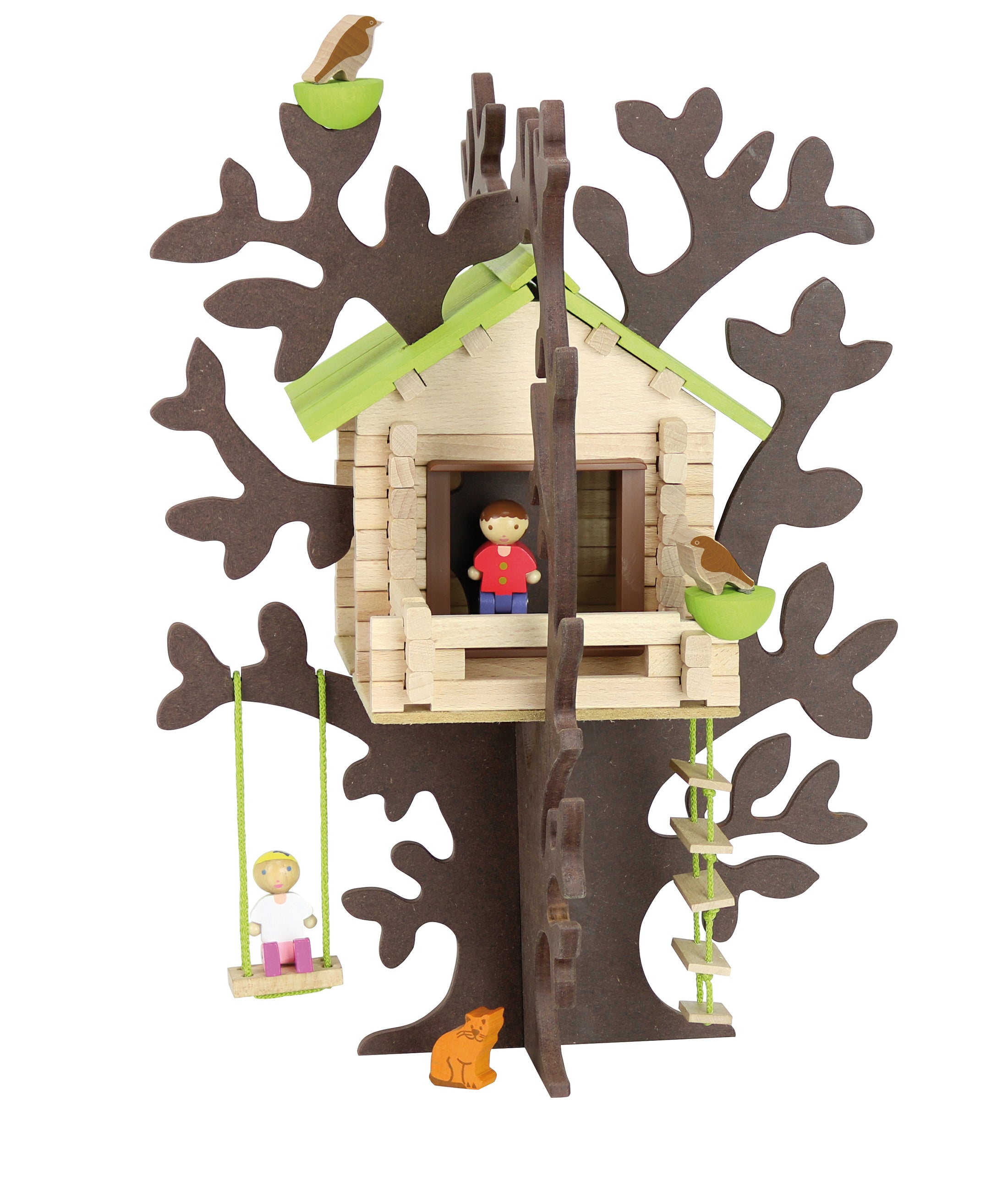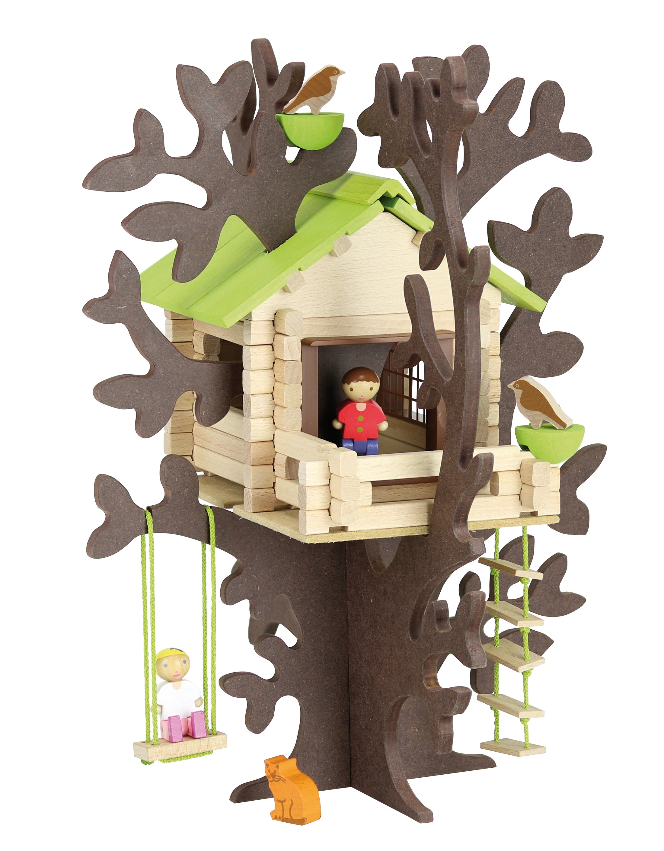 Apró házacska, amit a lombok közé kell építened. Fa építőjáték számos kiegészítővel és szerelési útmutatóval egy kis bőröndben.
