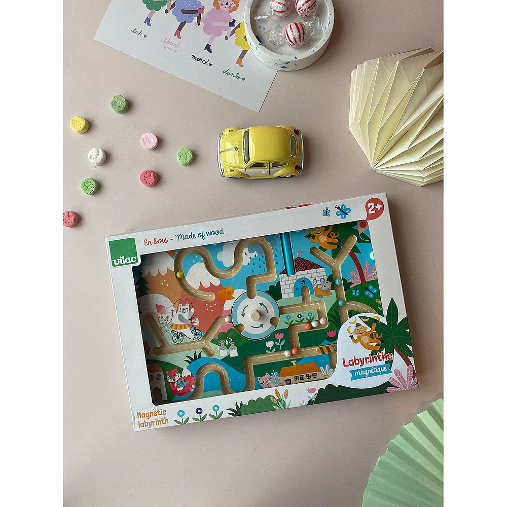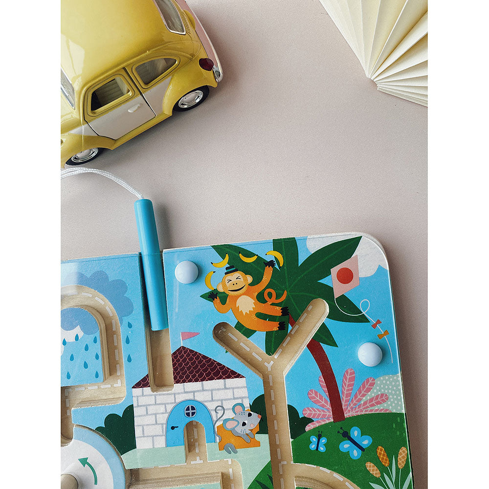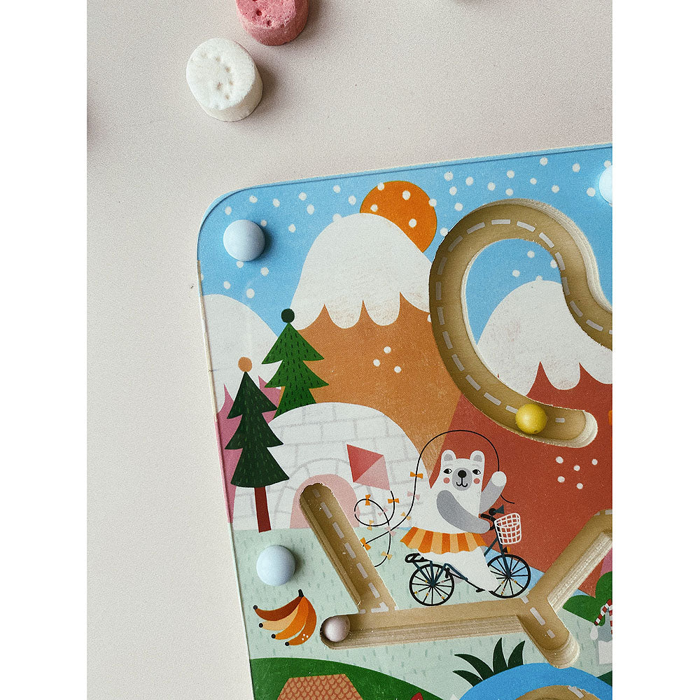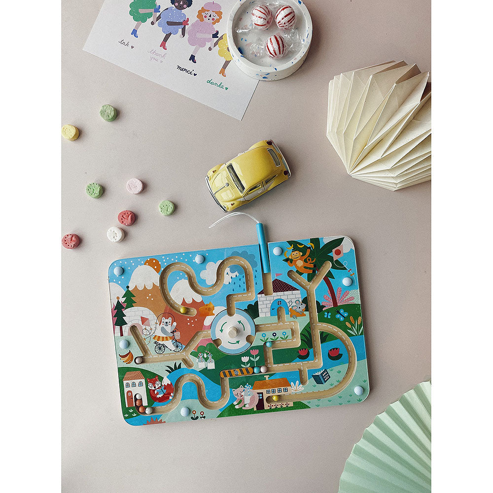 Fából készült ügyességi játék, ahol egy kis mágnesrúddal kell a golyókat eljuttatni különböző helyekre. Egyszerre fejleszti a kézügyességet és az asszociációs készséget.